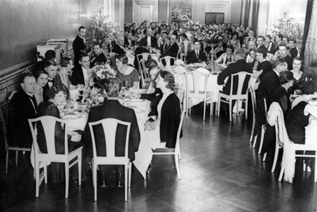 En række københavnske honoratiores, ca. 100, fik en invitation fra Knud Rasmussen til en middag på Paladshotellet. Alle var meget beærede over, at vor store helt havde inviteret netop dem, så alle mødte op. Med Knuds evner som selskabsmand blev middagen naturligvis en stor succes, og da de var færdige med at spise, rejste Knud sig, slog på glasset og sagde: "Nu håber jeg, at alle er mætte, at alle er glade og at alle har det godt." Da der jo var blevet spist og drukket godt, så bedyrede alle, at netop sådan forholdt det sig. Derpå fortsatte Knud: "Jamen, så er der kun et spørgsmål tilbage. Hvem skal betale?" Tavshed! Da gæsterne havde sundet sig lidt, og hver især havde tænkt over sit omdømme i kredsen, hvis netop han viste sig nærig, så fik alle tegnebøgerne frem, hvorpå Knud sagde: "Nu, hvor I allerede har tegnebøgerne fremme, så har Peter (Freuchen) og jeg nogle planer, som vi gerne skulle have finansieret." Alle indså nu, at slaget var tabt. Middagen blev betalt, og der blev doneret en klækkelig skilling til planernes realisering.